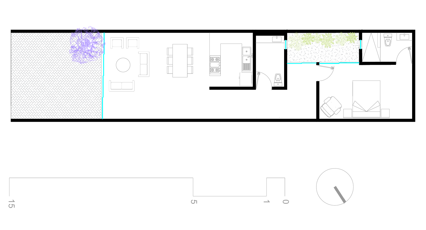 Casa Jacaranda es un proyecto planteado sobre un terreno subdividido que cuenta con dimensiones de 5x20 metros. La alargada forma nos permite crear un proyecto que se va recorriendo linealmente mientras lo vas descubriendo y viviendo a traves de sus espacios.